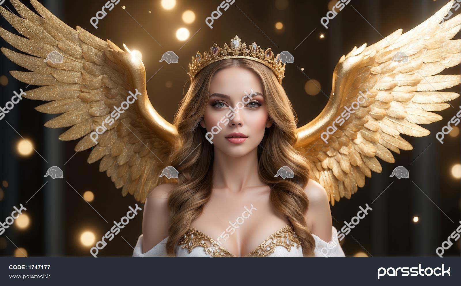 طرح فرشته زن با تاج و بال‌های طلایی و نور درخشان برای پوستر دیواری لوکس