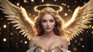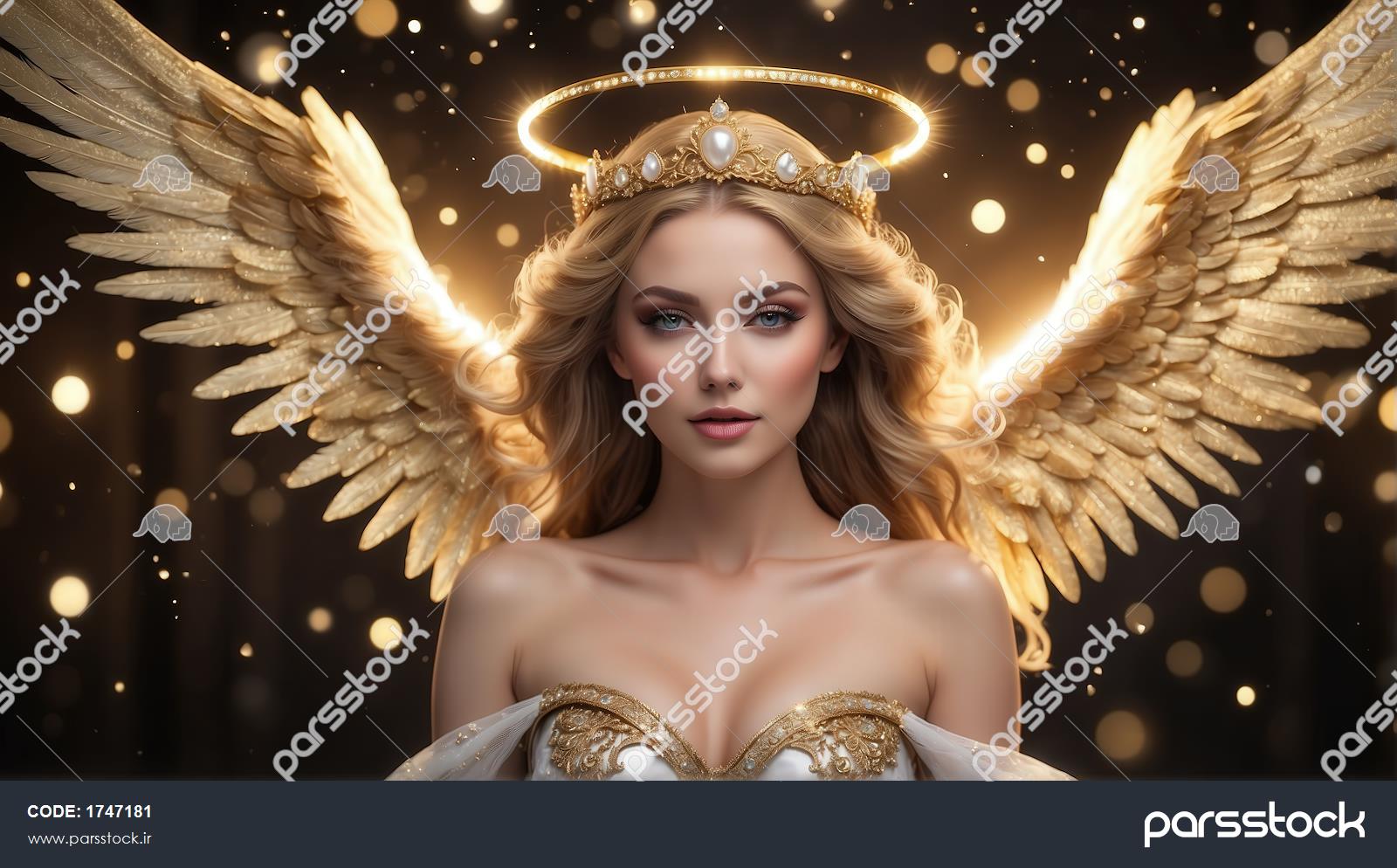 عکس فرشته زن با هاله‌ی نورانی و بال‌های طلایی برای پرده و روتختی