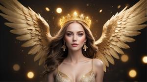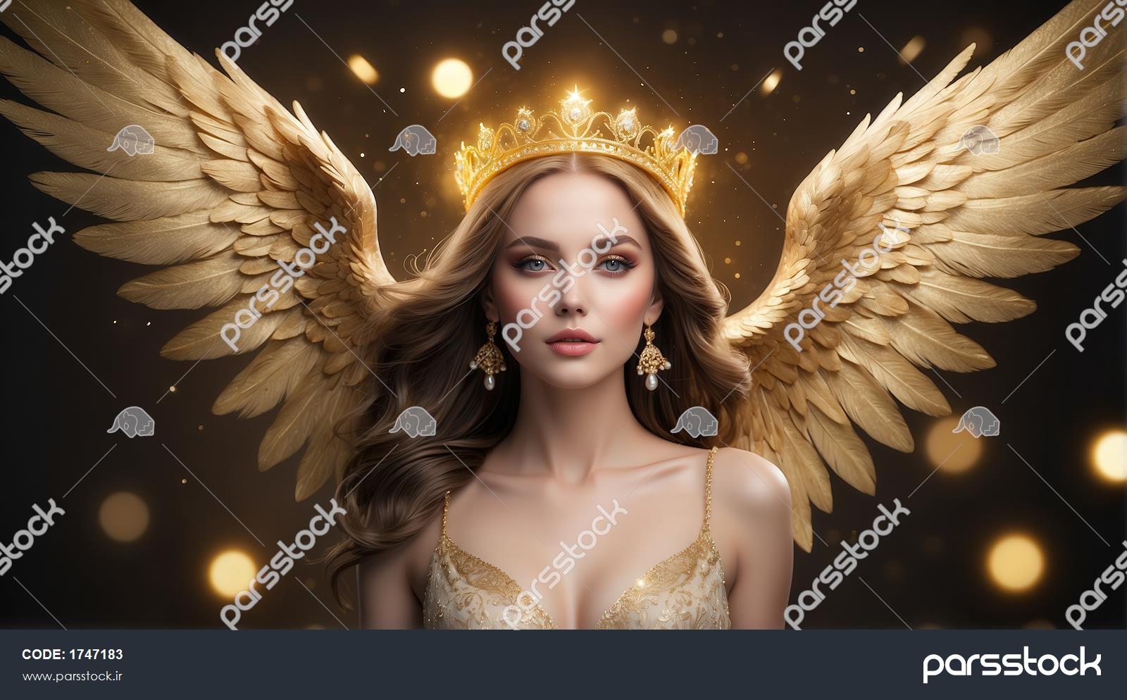 طرح ملکه فرشته فانتزی با تاج و بال‌های طلایی برای چاپ روی کوسن و ماگ