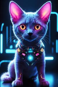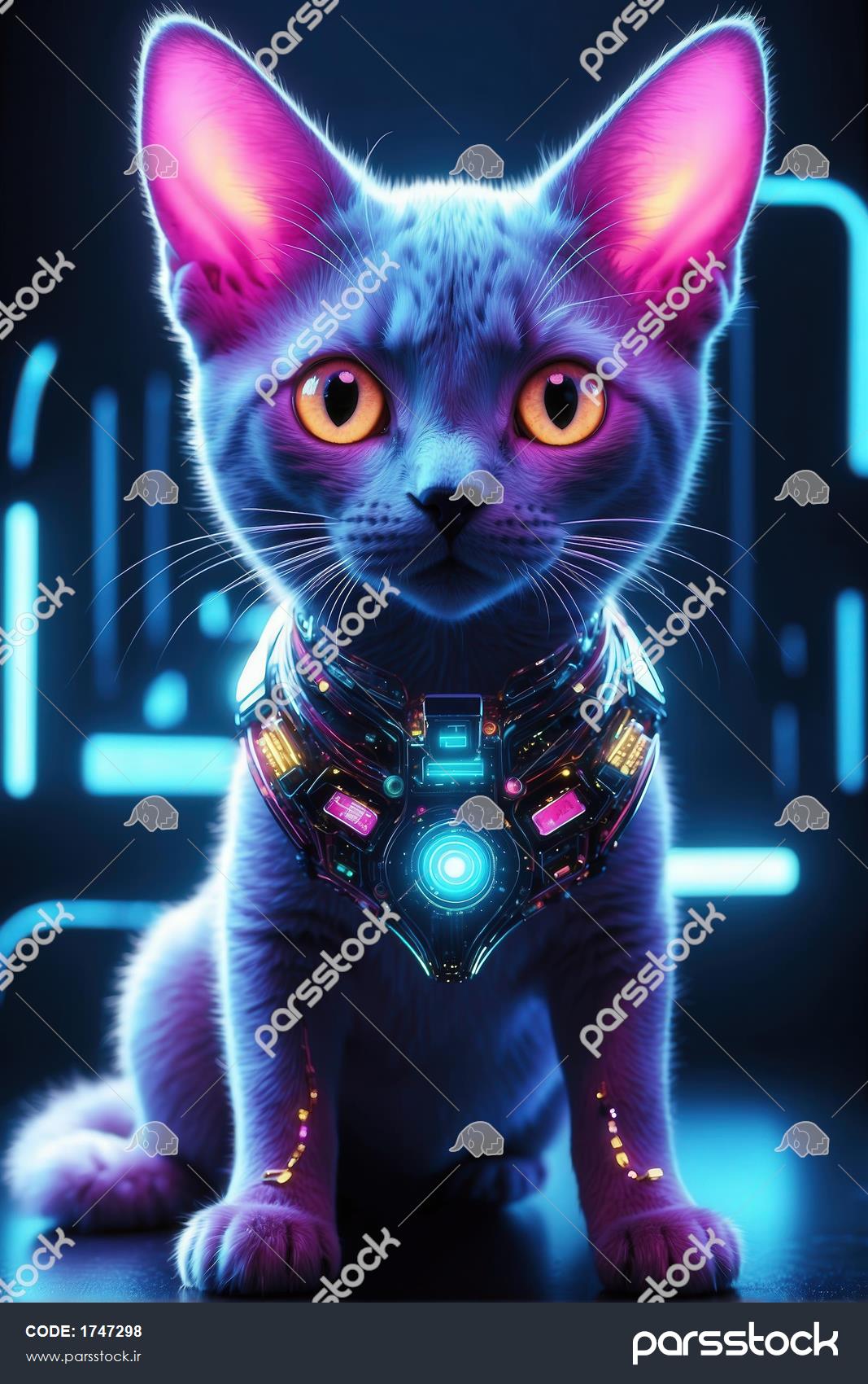 عکس گربه سایبرپانک با گردنبند نئونی برای پوستر اتاق نوجوان فانتزی