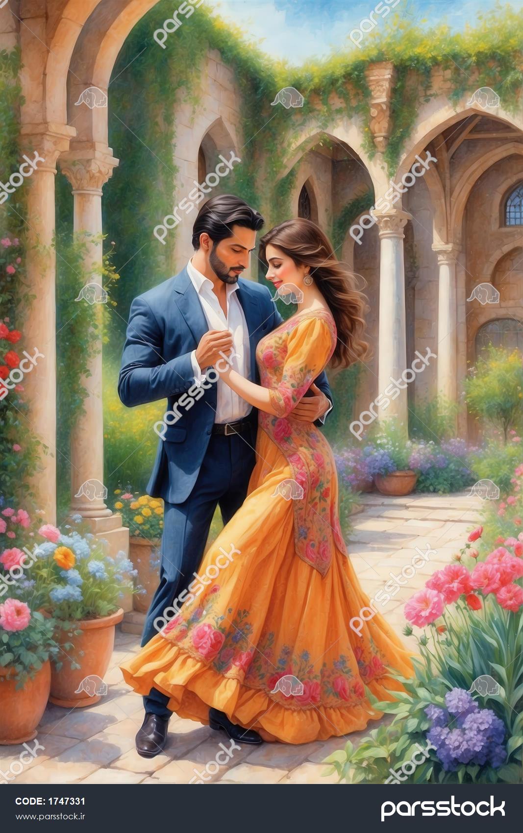 عکس رقص عاشقانه زوج با لباس نارنجی و آبی در باغ قدیمی برای دکور منزل