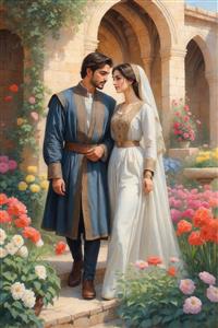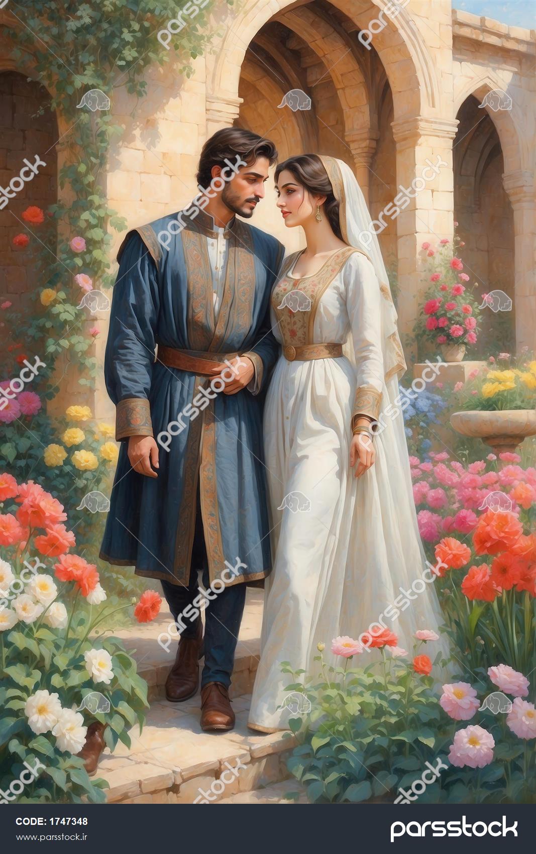 عکس قدم زدن عاشقانه زوج ایرانی در باغ قدیمی برای تابلو رمانتیک