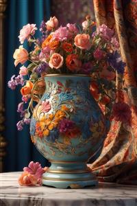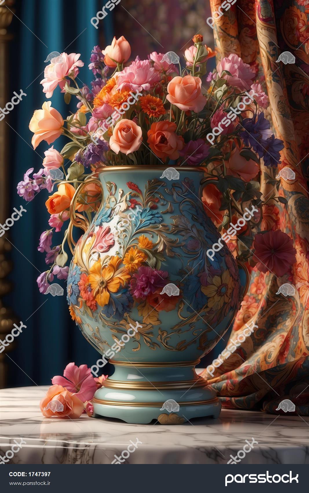 تصویر گلدان برجسته فیروزه‌ای با گل‌های صورتی و تزئینات طلایی برای چاپ