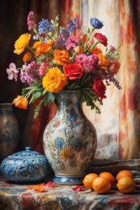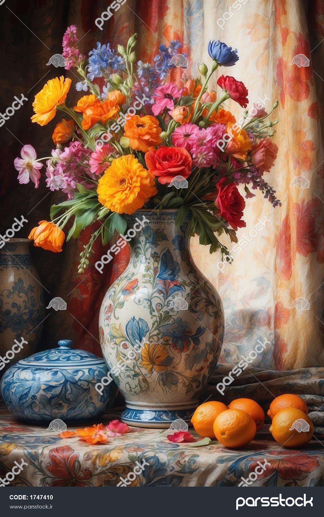 طرح گلدان آنتیک با گل‌های انبوه و پرتقال مناسب چاپ عریض پرده