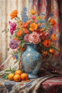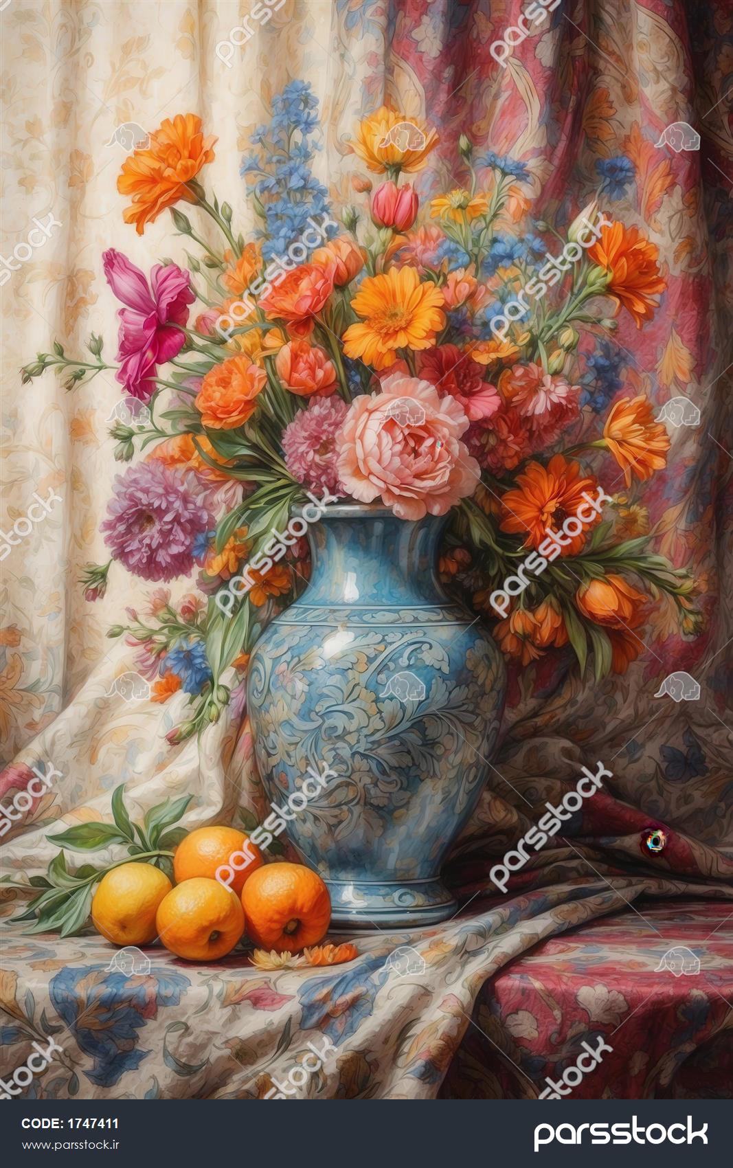 عکس گلدان آبی پر از گل‌های نارنجی و پرتقال برای تابلو منزل باکیفیت