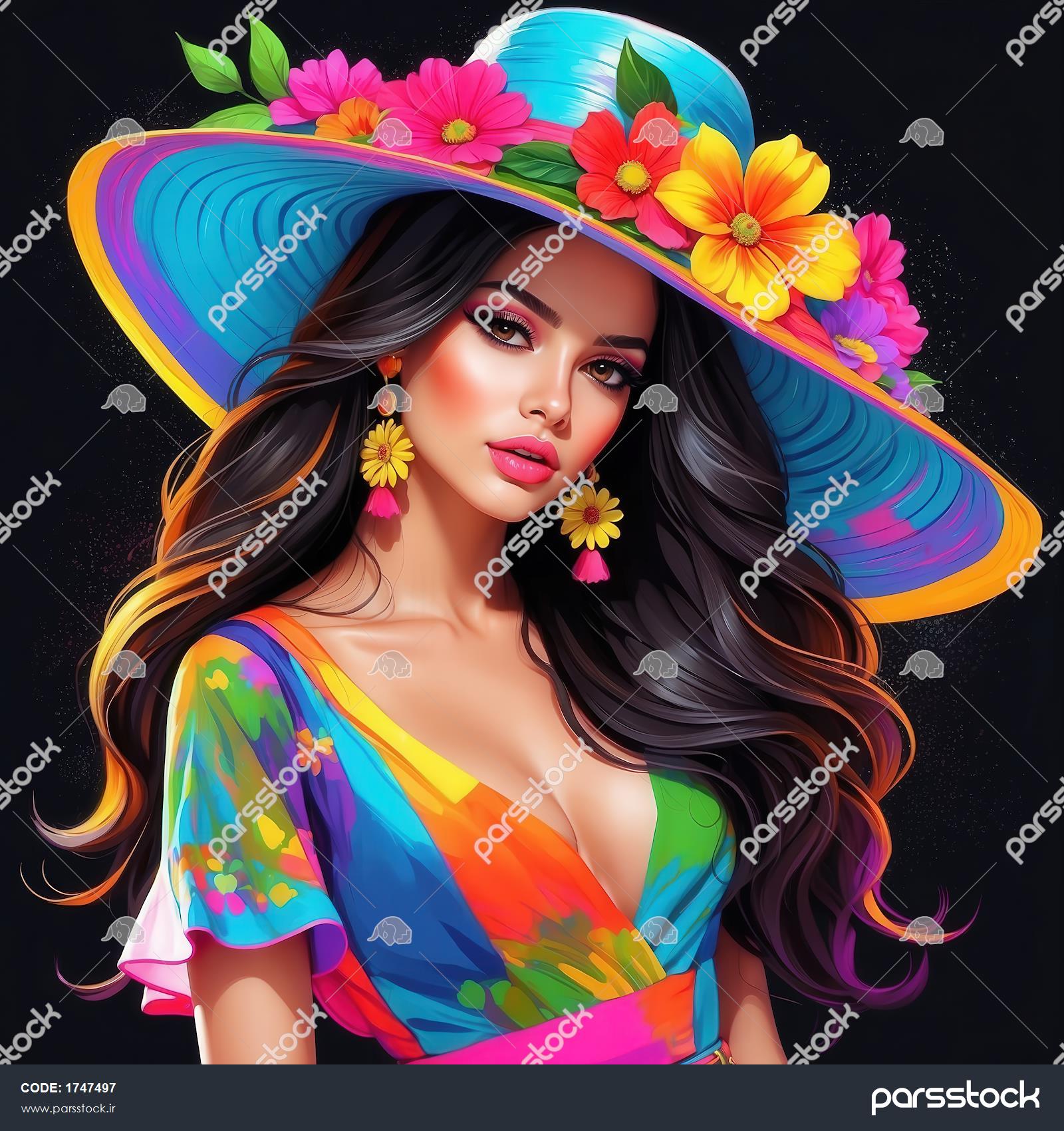 عکس زن با لباس رنگین‌کمانی و کلاه آبی برای پوستر پس‌زمینه تیره