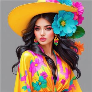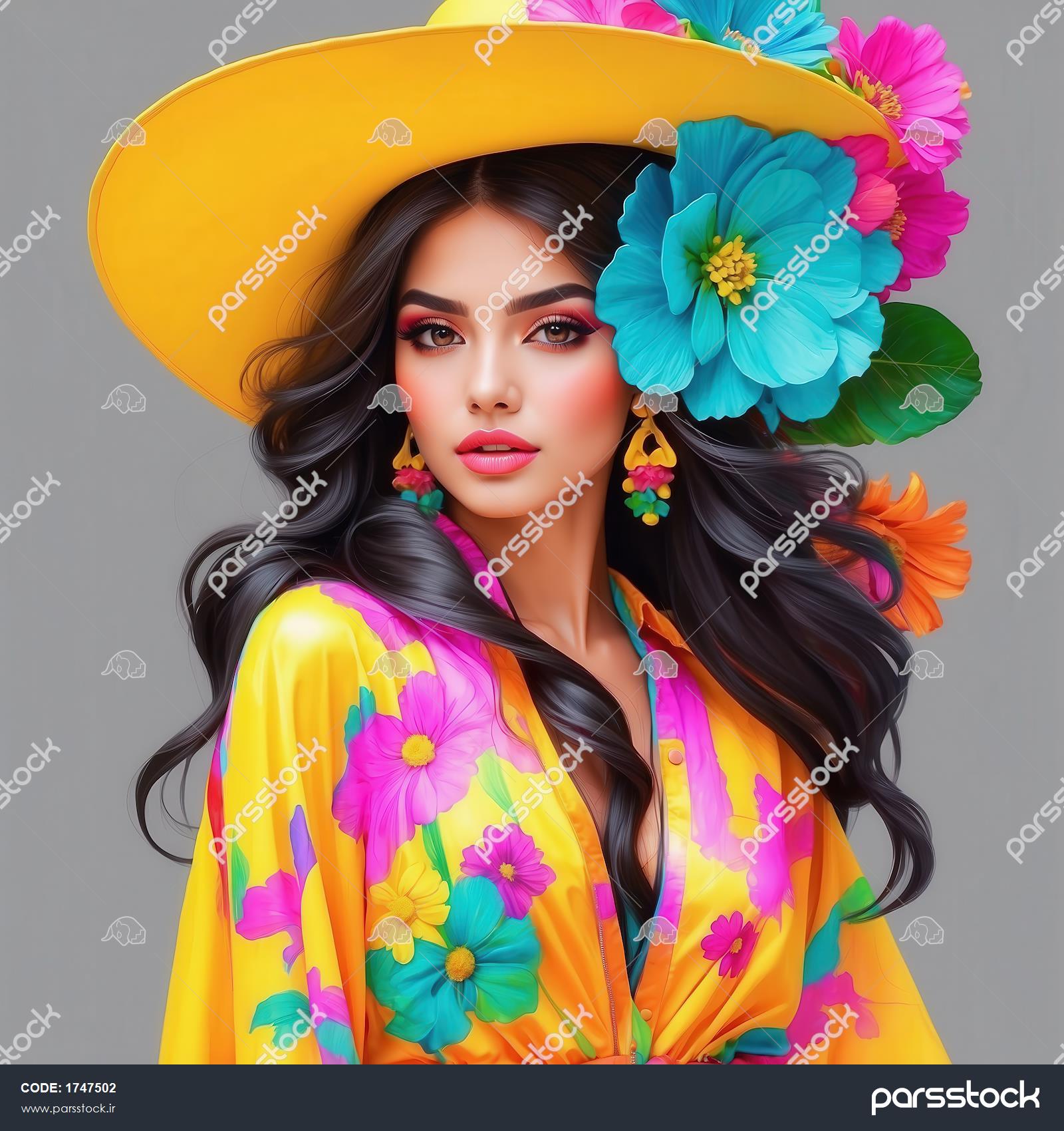 طرح زن با پیراهن و کلاه زرد گلدار برای چاپ روی پرده و روتختی
