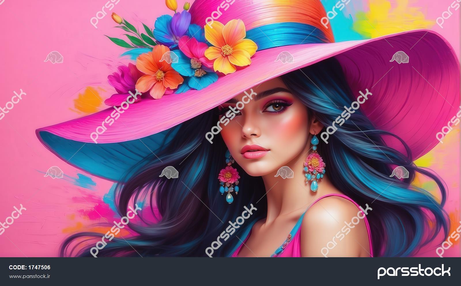 عکس زن با کلاه بزرگ صورتی و گوشواره‌های آبی برای پوستر باکیفیت