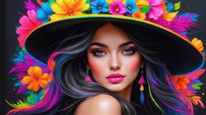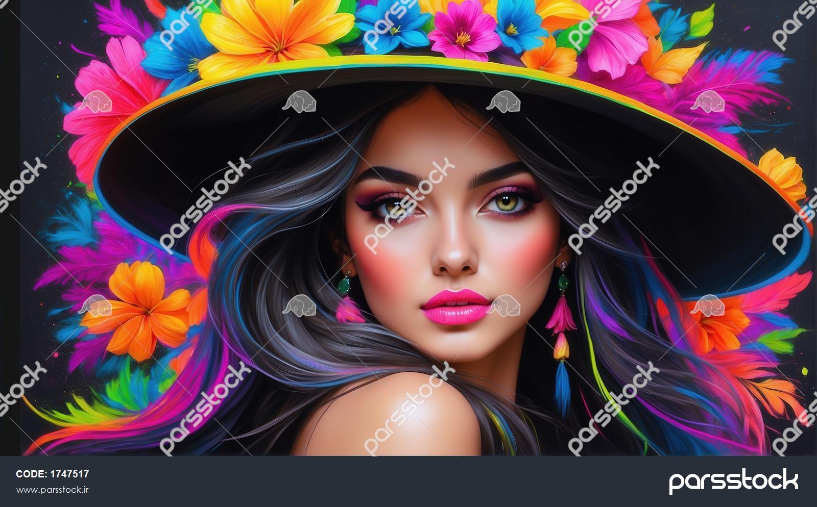 تصویر زن با کلاه مشکی و گل‌های نئونی برای چاپ روی پرده و پارچه