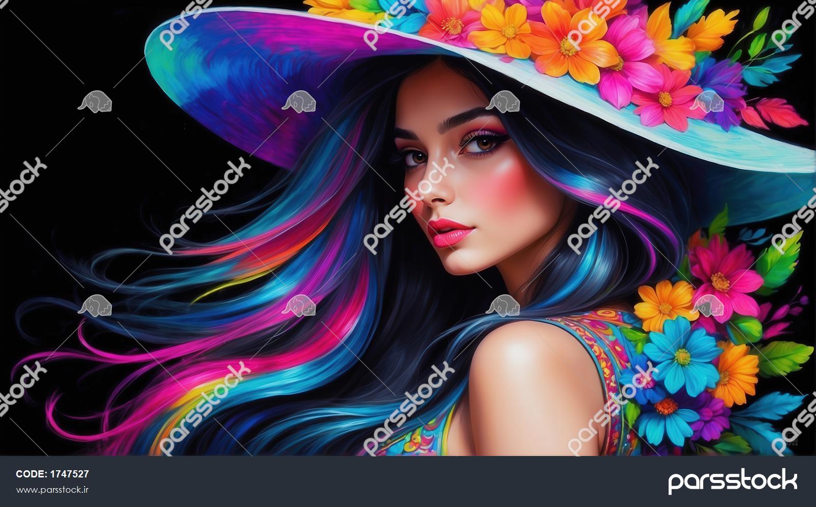 عکس زن با کلاه بزرگ گل‌گلی رنگارنگ برای تابلوی دکوراتیو نشیمن