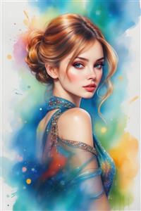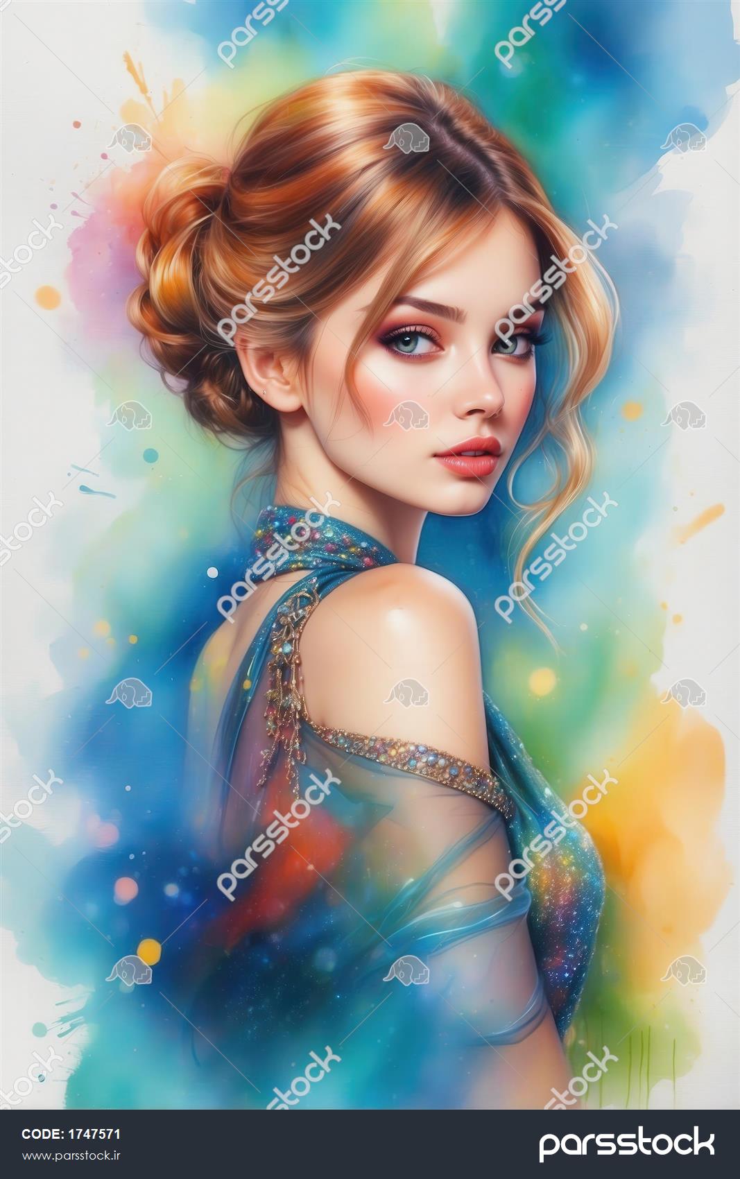 طرح نقاشی پرتره زن با مدل موی بسته و لباس آبی برای چاپ کوسن