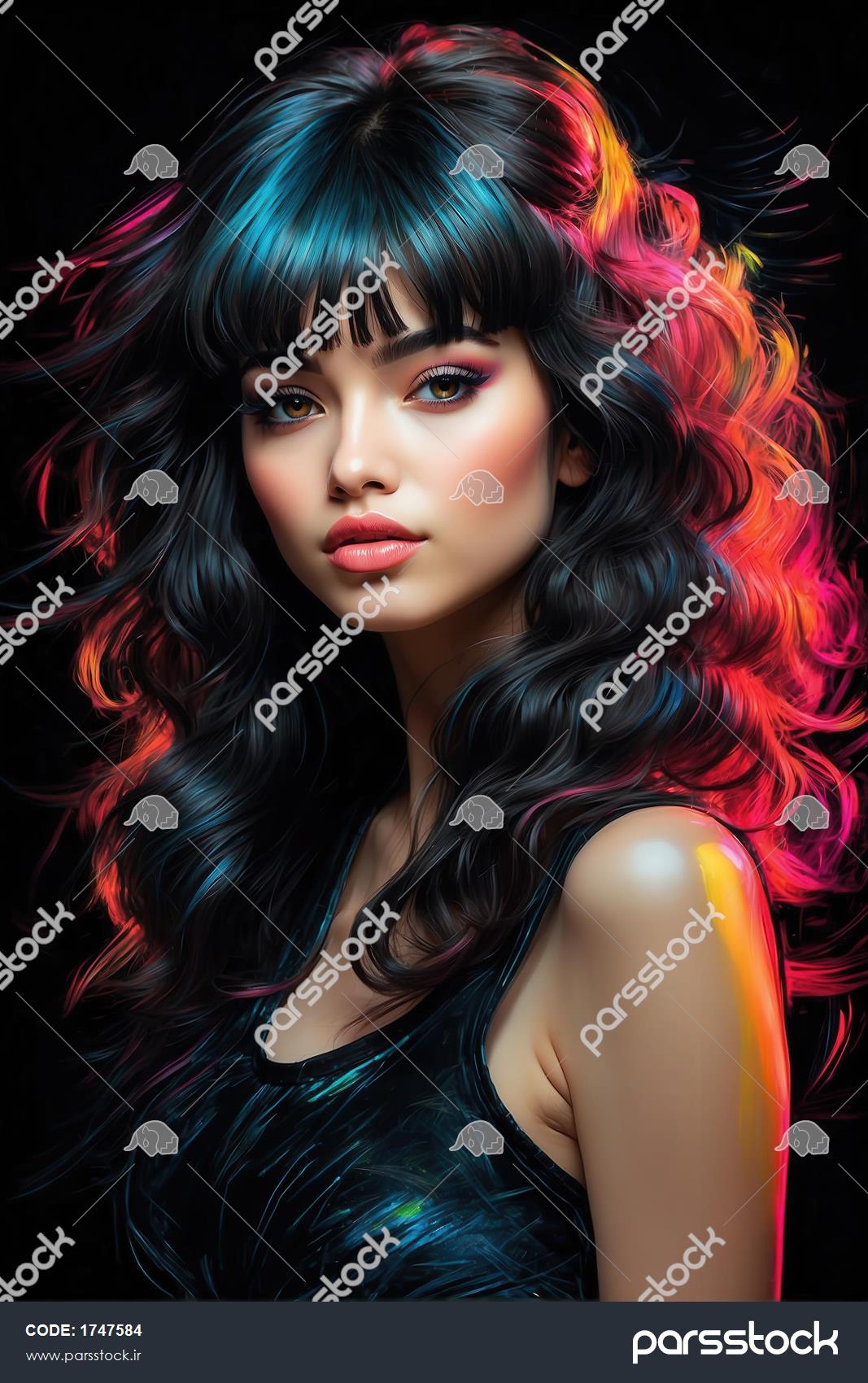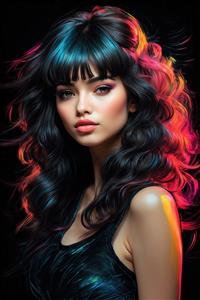 نقاشی پرتره زن با موهای بلند و لباس فیروزه‌ای با هایلایت نئونی دکوراتیو