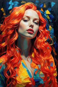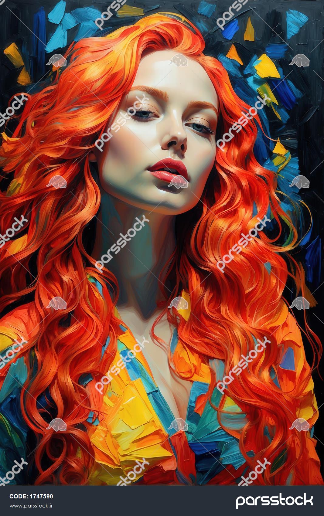 تصویر نقاشی پرتره زن با موهای نارنجی و لباس رنگی برای تابلو دکوراتیو باکیفیت