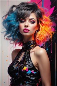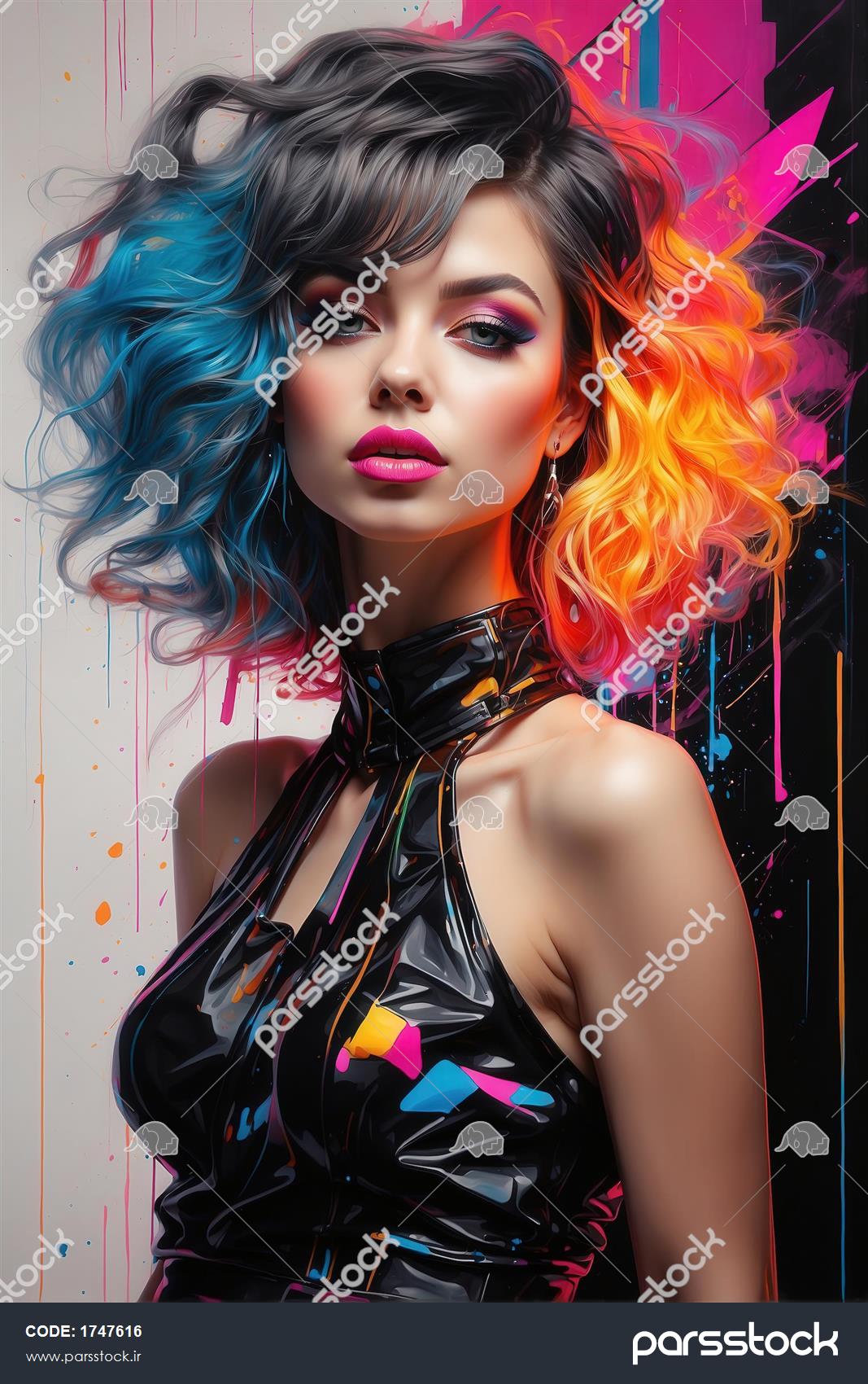 تصویر زن با موی دو رنگ (تیره و نارنجی/آبی) نئونی برای پوستر دیواری