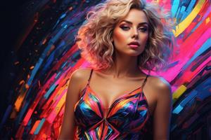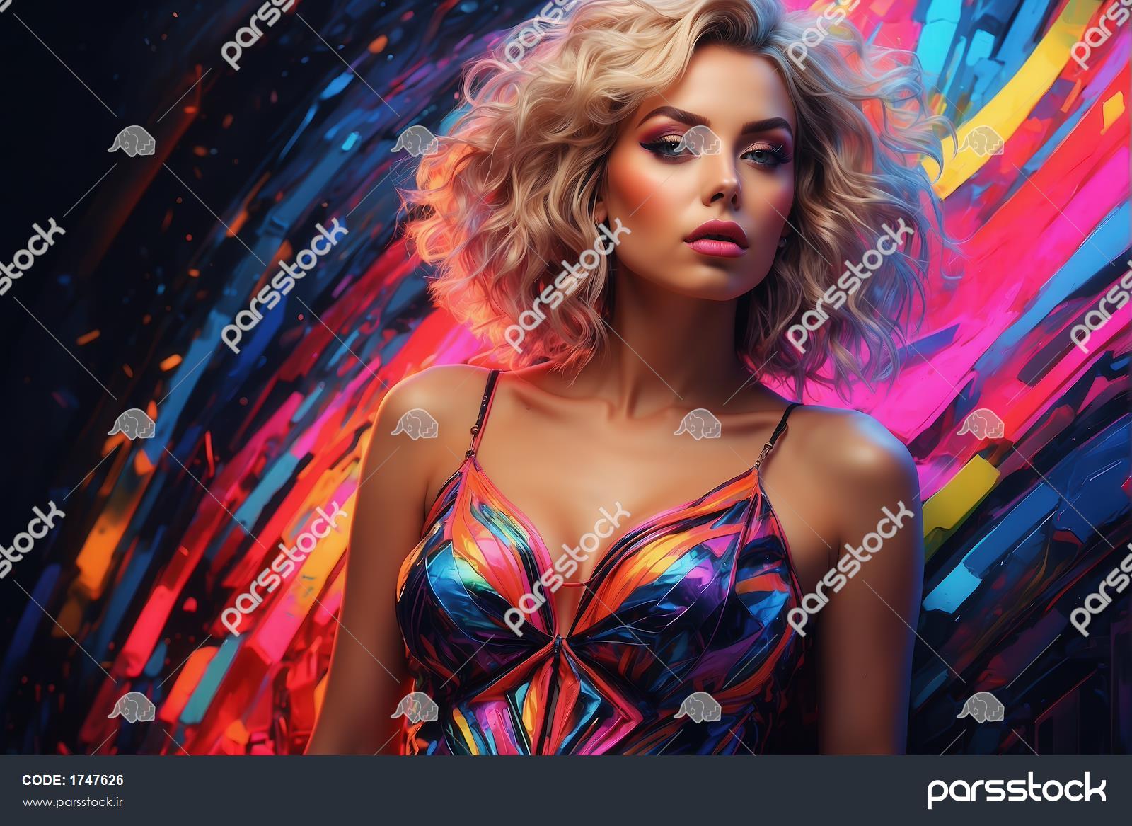 طرح پرتره زن با موی فر بلوند نئونی برای چاپ روی پوستر دیواری