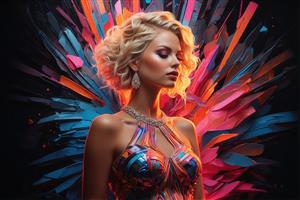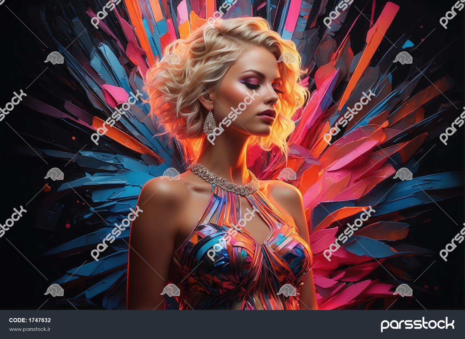 طرح زن با لباس مجلسی رنگارنگ و پس‌زمینه انفجاری برای پوستر