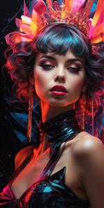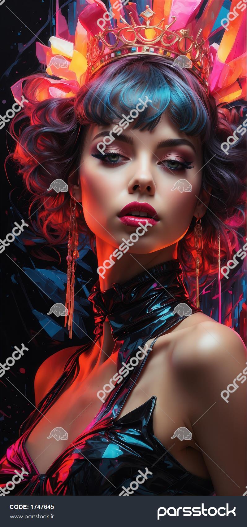 طرح زن مو کوتاه بلوند با لباس هولوگرام رنگین‌کمان برای تابلو مدرن