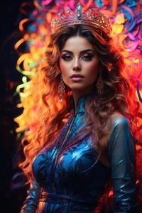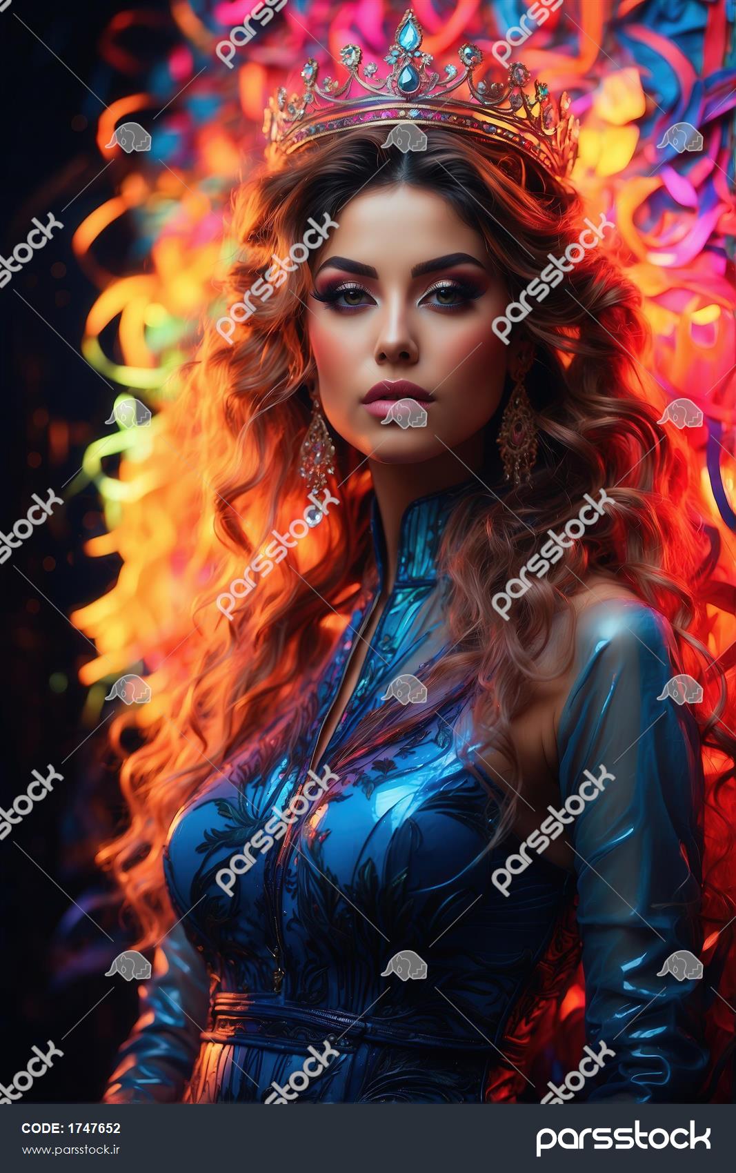 تصویر زن مو بلند با لباس براق آبی و تاج برای چاپ عریض روی پرده