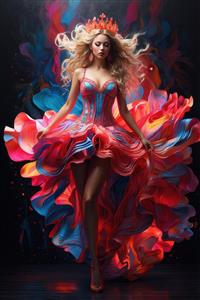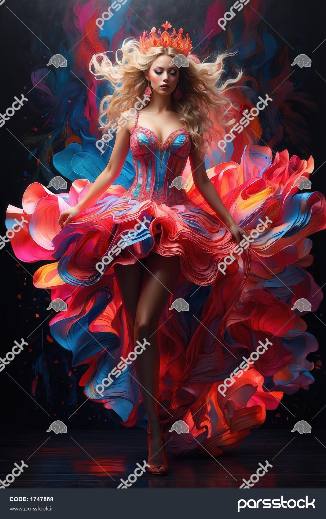 عکس زن با لباس مجلسی فانتزی رنگارنگ برای چاپ روی بوم‌های خاص