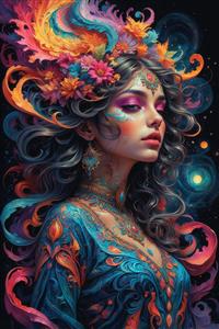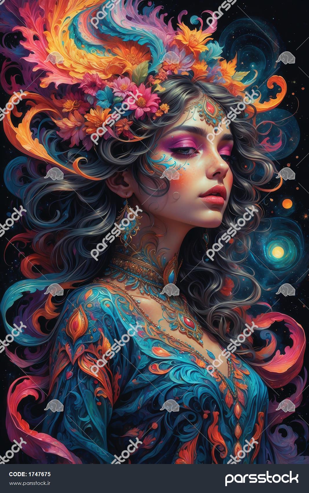 عکس زن با موهای فرفری و لباس پرنقش و نگار برای چاپ روی بوم و تابلو