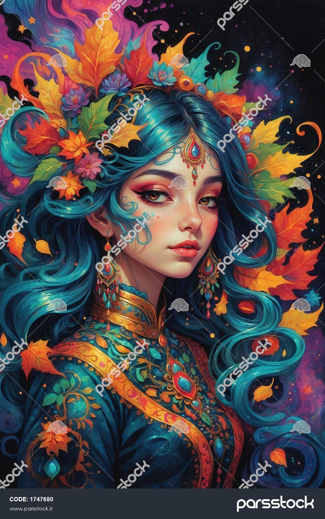 تصویر زن با موهای آبی اقیانوسی و تاج برگ‌های پاییزی برای دکوراسیون اتاق