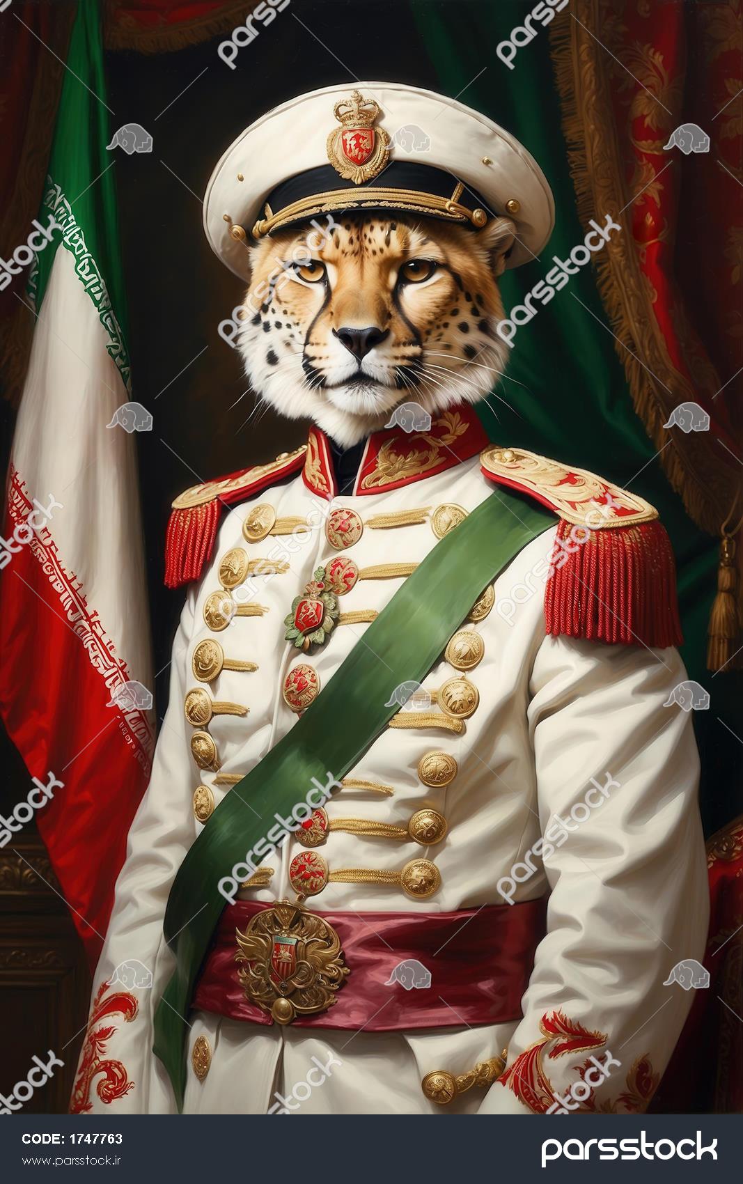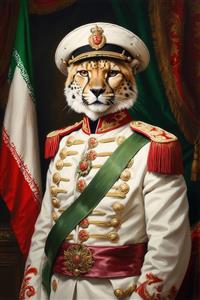 تصویر یوزپلنگ با یونیفرم سفید سلطنتی سبز و پرچم ایران برای چاپ عریض