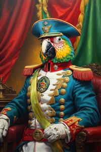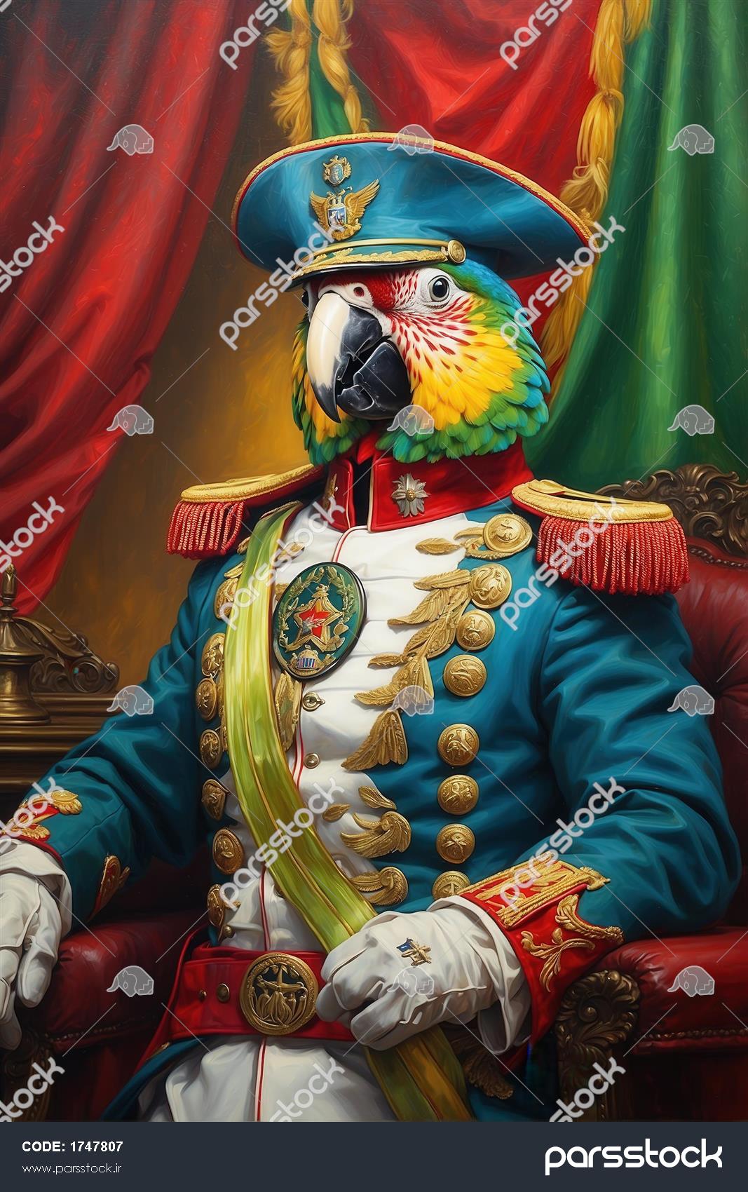 طرح پرتره طوطی ماکائو در لباس سلطنتی آبی و سبز برای چاپ پرده