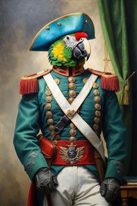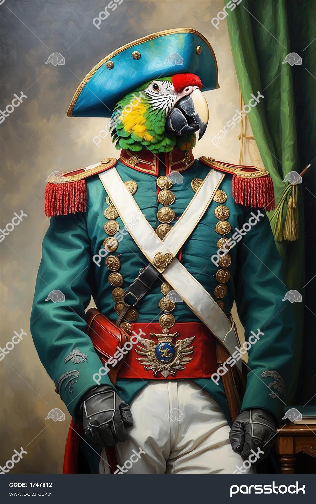 طرح طوطی با یونیفرم فیروزه‌ای سبز و کلاه ناپلئونی برای دکوراسیون کلاسیک