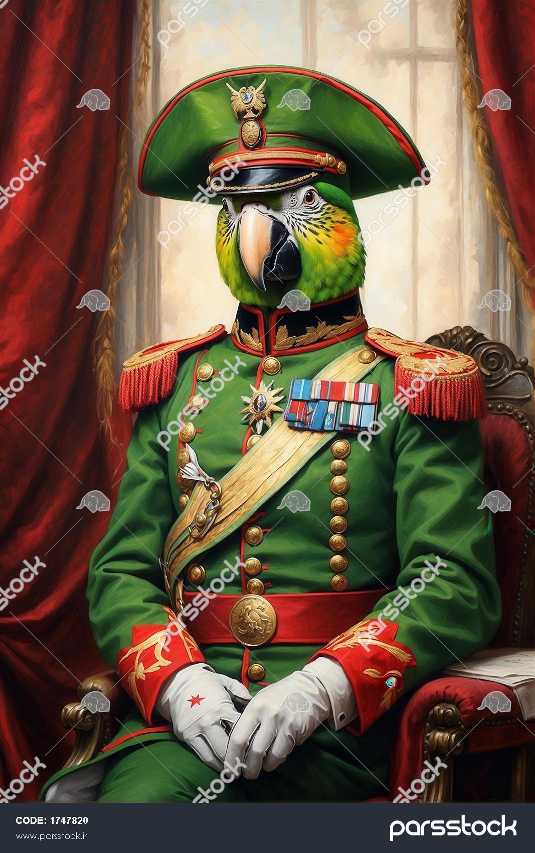 تصویر طوطی ژنرال با لباس سبز رسمی و مدال برای تابلو دکوراتیو نشیمن