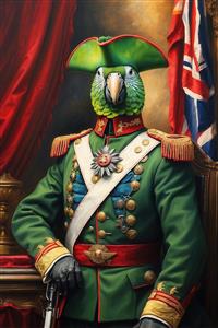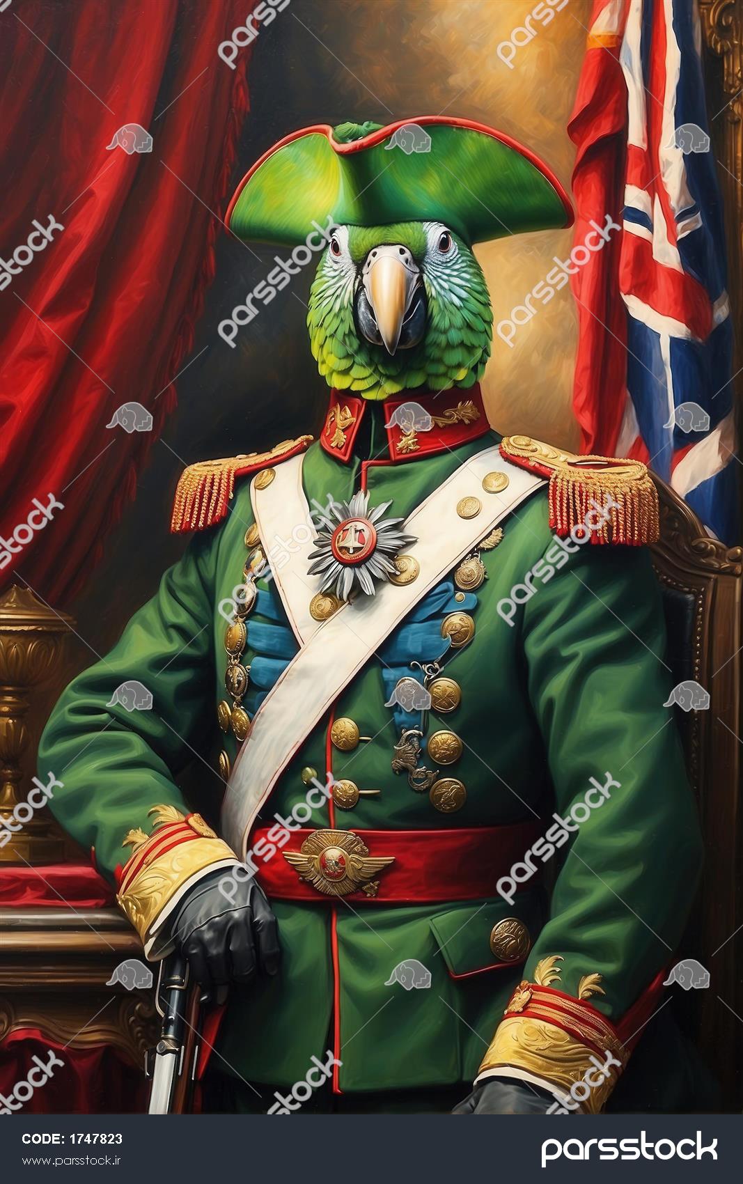تصویر طوطی ژنرال با یونیفرم سبز سلطنتی و کلاه لبه‌دار برای پوستر دیواری