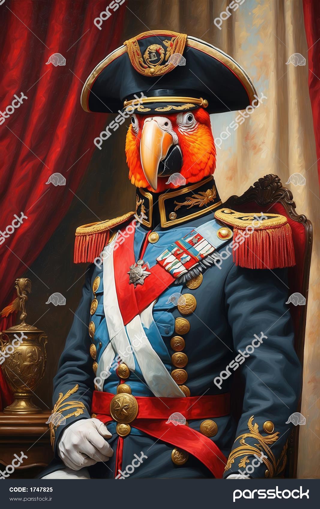 عکس طوطی قرمز پرمدال با لباس نظامی آبی برای تابلو دکوراتیو کلاسیک