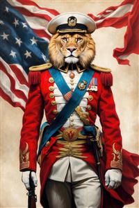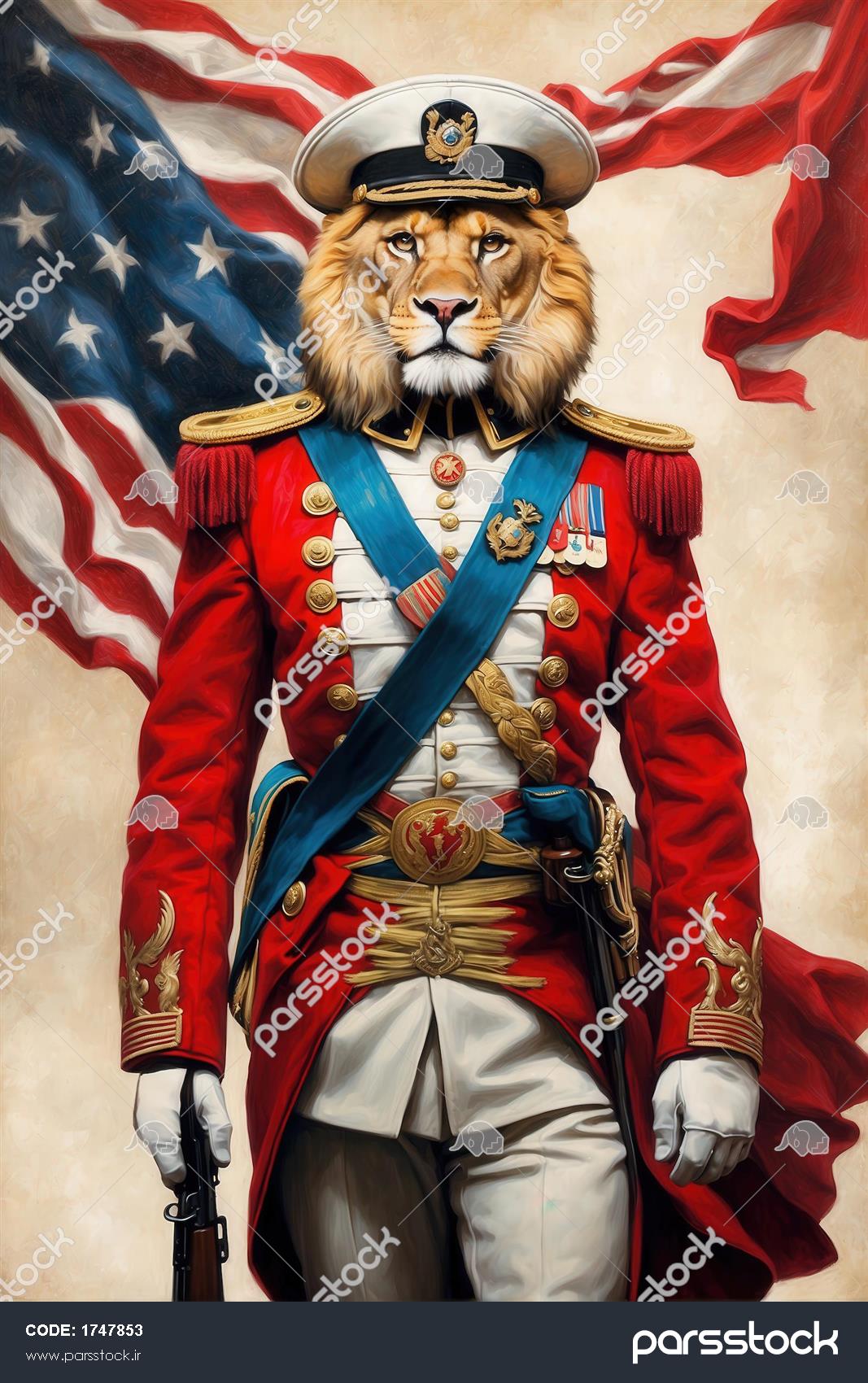 عکس شیر نظامی با پرچم آمریکا و یونیفرم قرمز و سفید برای پوستر باکیفیت