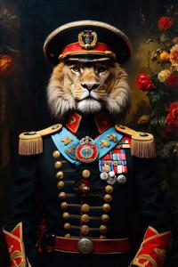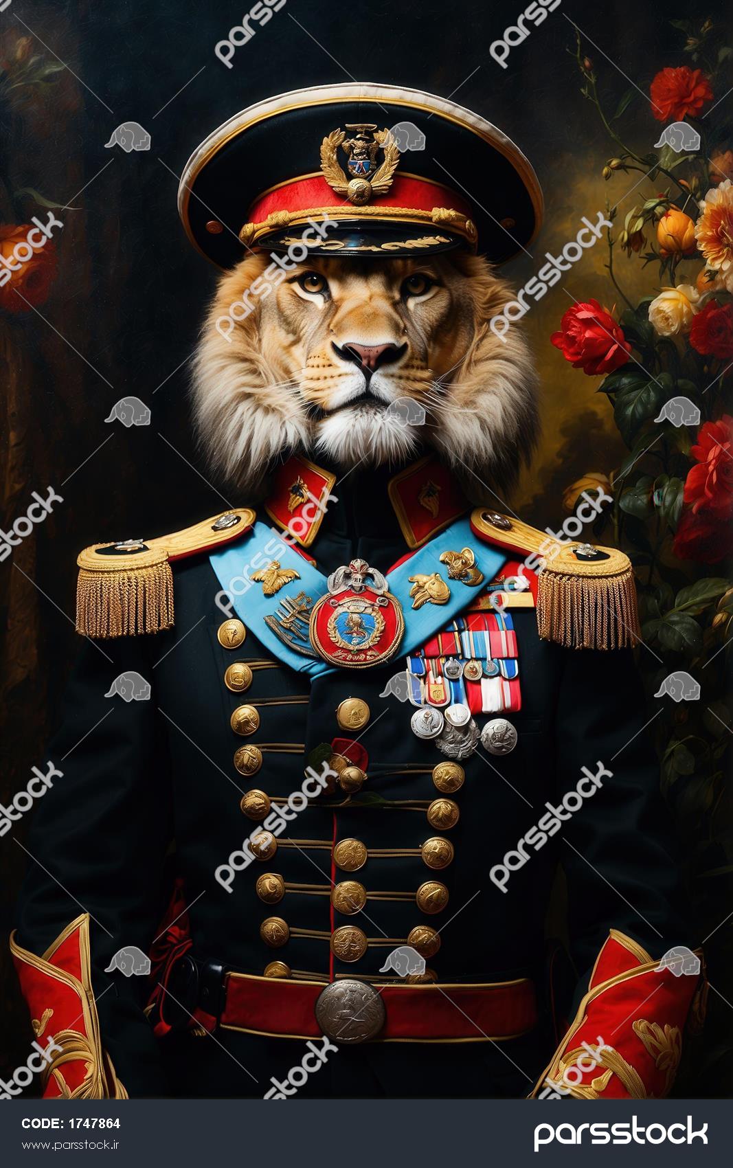 طرح شیر فانتزی با یونیفرم مشکی و روبان آبی در میان گل‌ها برای تابلو