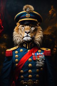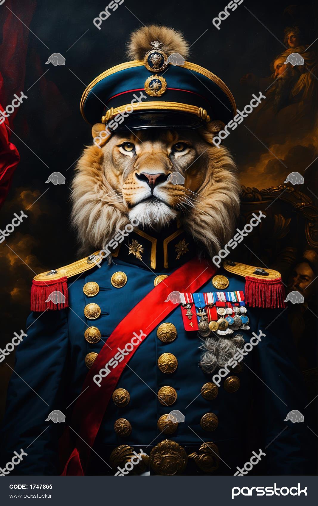 طرح شیر ژنرال با کلاه و یونیفرم مشکی در پسزمینه بژ و قرمز برای تابلو طرح شیر ژنرال با کلاه و یونیفرم سرمهای و پرده قرمز برای چاپ پرده پرتره شیر سلطنتی با یونیفرم آبی و مدالهای طلایی برای پوستر دیواری پرتره شیر سلطنتی با یونیفرم مشکی و روبان آبی در زمینه گل برای پوستر پرتره شیر سلطنتی با یونیفرم قرمز پرمدال و شال آبی برای تابلو پذیرایی طرح شیر فانتزی با یونیفرم مشکی و روبان آبی در میان گلها برای تابلو عکس شیر با لباس ژنرال نظامی آبیتیره و شال قرمز برای دکور اتاق کار عکس پرتره شیر سلطنتی نشسته با یونیفرم قرمز و پردههای کلاسیک برای تابلو نقاشی پرتره شیر سلطنتی با یونیفرم مشکی و پر تزئینی برای دکوراسیون تصویر شیر ژنرال با یونیفرم مشکی و گلهای رز قرمز برای دکوراسیون نمایش همه