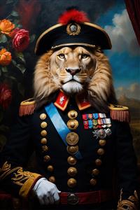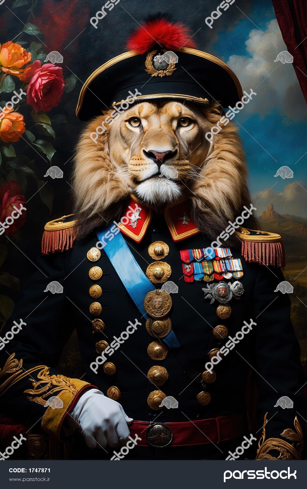 پرتره شیر سلطنتی با یونیفرم مشکی و روبان آبی در زمینه گل برای پوستر