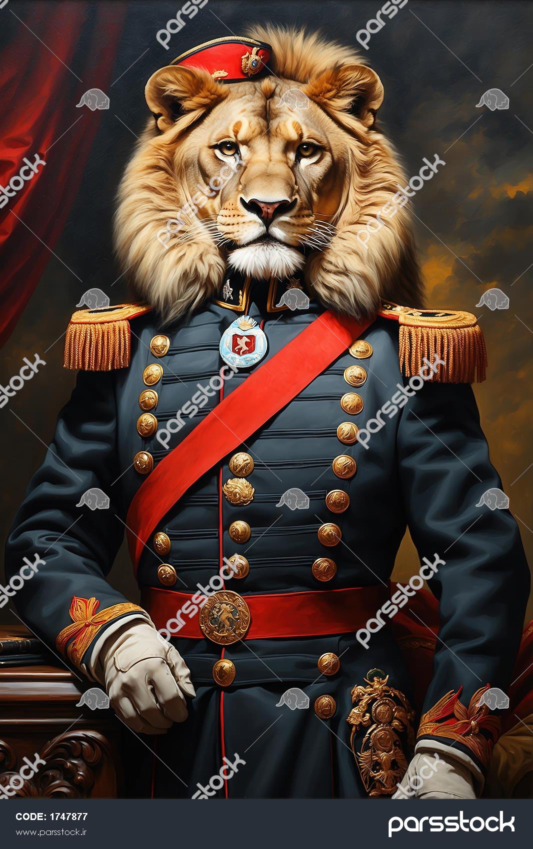 تصویر شیر سلطنتی با یونیفرم قرمز و شال آبی در پسزمینه لوکس برای دکور پرتره شیر سلطنتی با یونیفرم تیره و نشان بزرگ طلایی برای چاپ روتختی طرح شیر فانتزی با یونیفرم مشکی و روبان آبی در میان گلها برای تابلو پرتره شیر سلطنتی با یونیفرم تیره و زمینه گلهای سرخ برای چاپ پرده نقاشی پرتره شیر سلطنتی با یونیفرم قرمز و شال آبی برای دکوراسیون کلاسیک نقاشی شیر نظامی با یونیفرم سرمهای و روبان قرمز برای چاپ پرده پرتره شیر سلطنتی با یونیفرم آبی و مدالهای طلایی برای پوستر دیواری طرح شیر نظامی فانتزی با کلاه قرمز و یونیفرم سرمهای برای چاپ کوسن تصویر شیر ژنرال با یونیفرم مشکی پرمدال و کلاه نظامی برای پوستر نقاشی شیر ژنرال با یونیفرم آبیتیره و شال قرمز در زمینه طوفانی نمایش همه