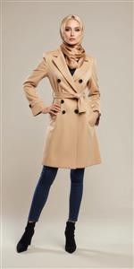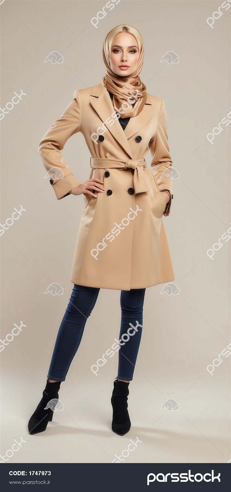 طرح مدل زن با حجاب طلایی و پالتوی شیک برای برندهای پوشاک