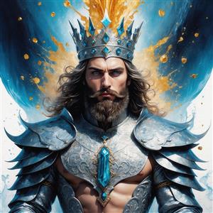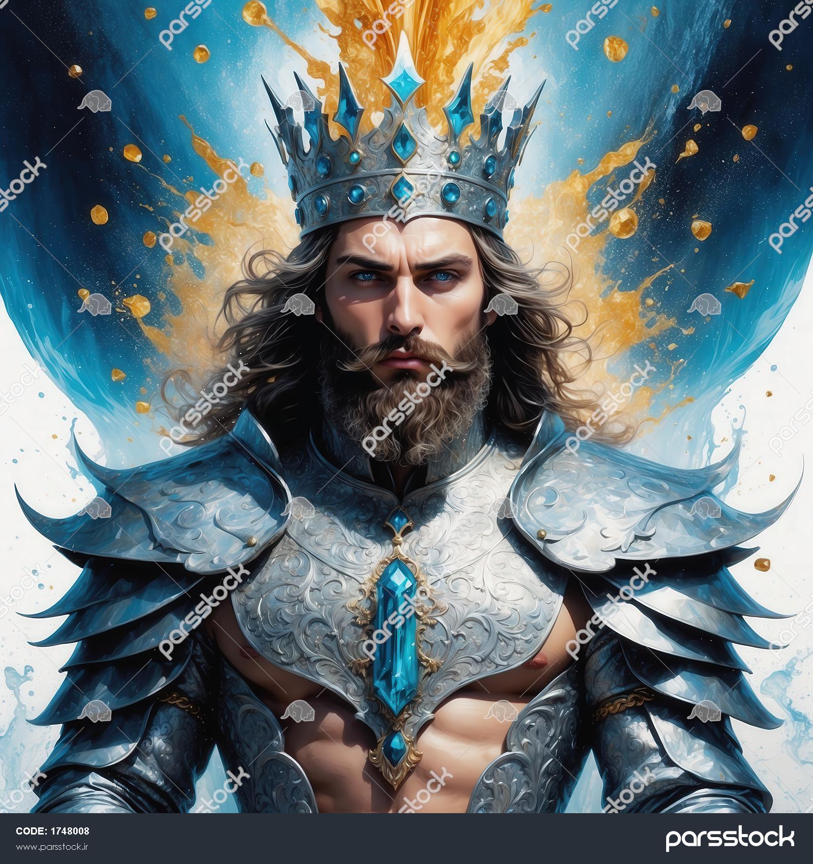 عکس پادشاه فانتزی با زره نقره‌ای در میان آب برای تابلو دکوراتیو نشیمن