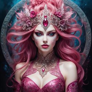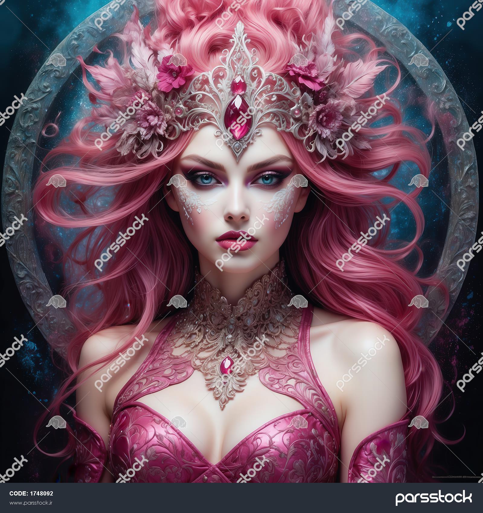 تصویر زن با موی صورتی، تاج گل و لباس سرخابی برای پوستر دکوراتیو