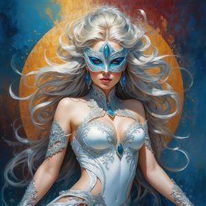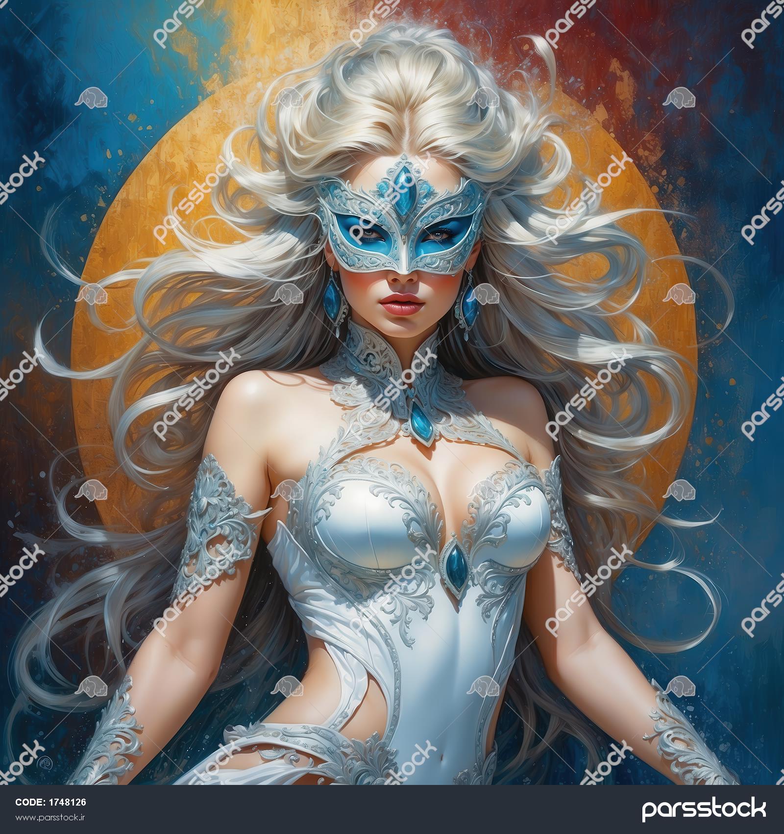تصویر الهه با موی نقره‌ای و لباس سفید و ماسک آبی برای پوستر اتاق خواب