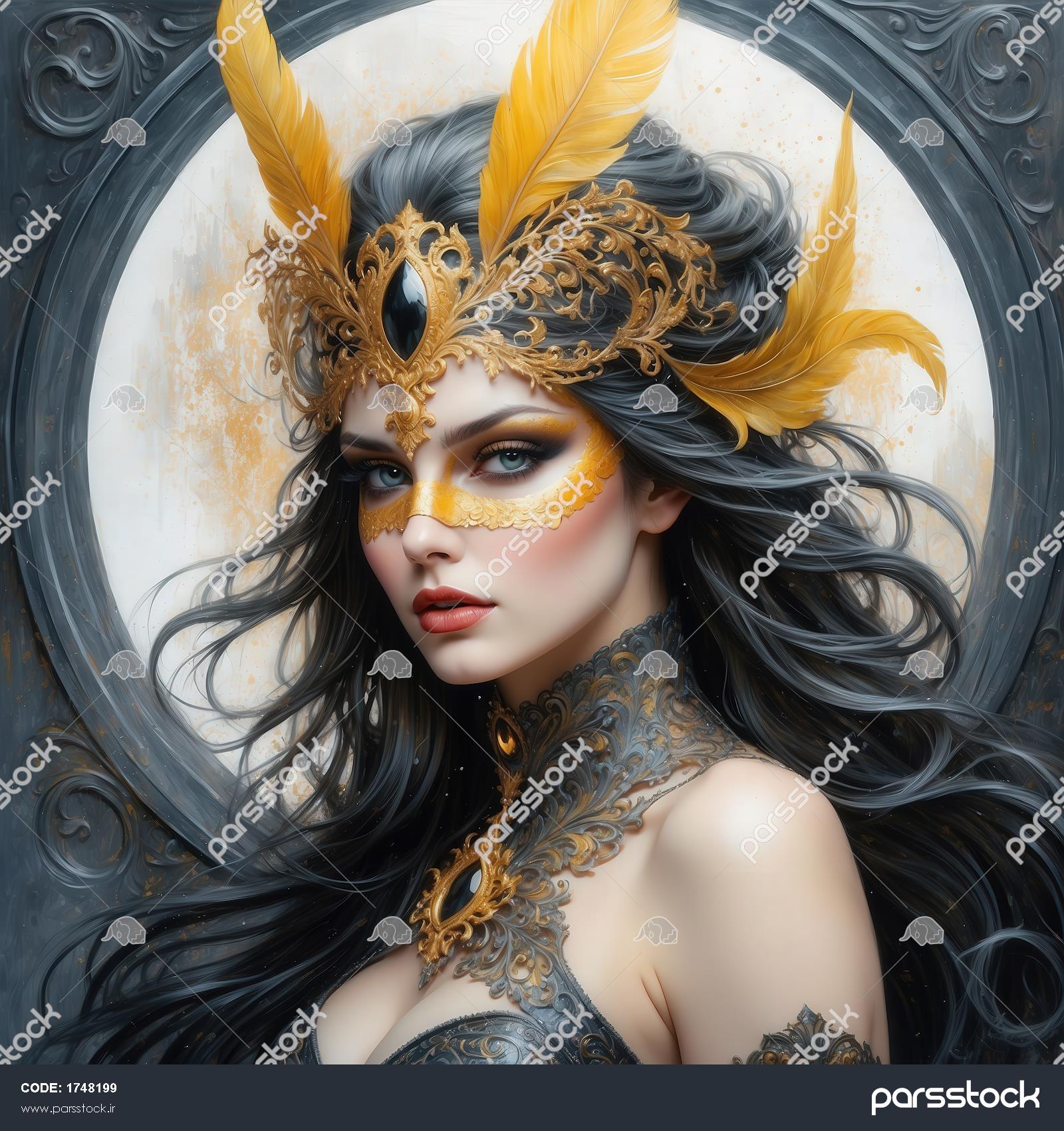 عکس زن با تاج طلایی و پرهای زرد فانتزی برای چاپ باکیفیت بالا