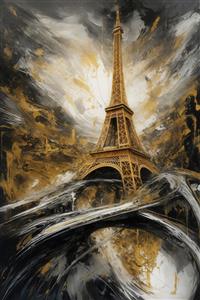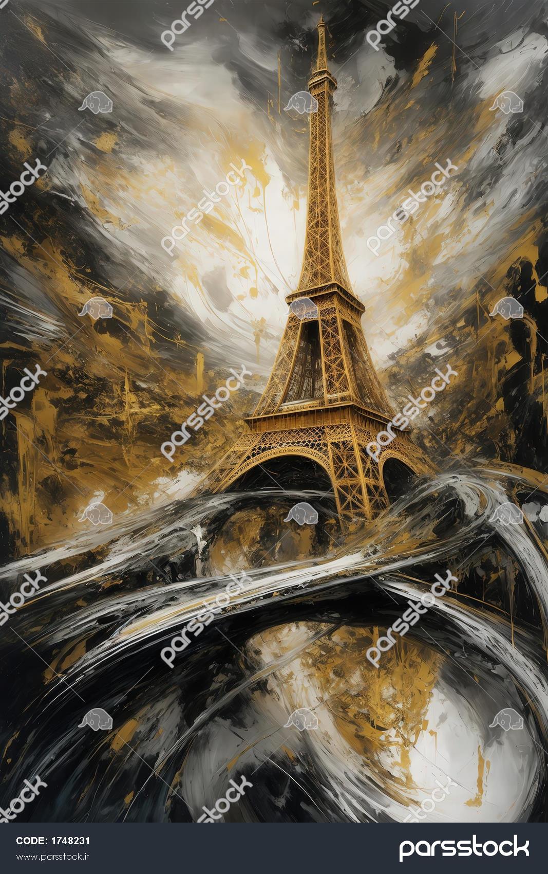 عکس برج ایفل با امواج تیره و بافت‌های آبستره طلایی برای تابلو