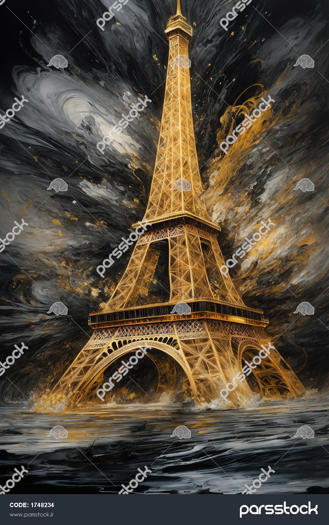 عکس برج ایفل با بافت خشن و طلایی در آب برای تابلو دکوراتیو