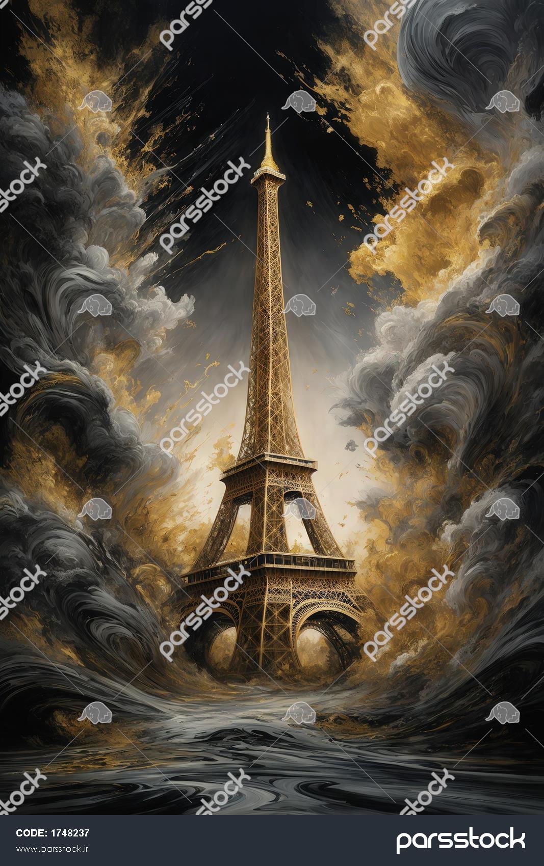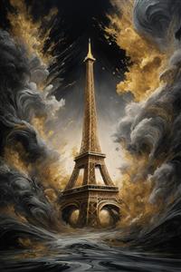 عکس برج ایفل با ابرهای متحرک طلایی و تیره مناسب پوستر سه‌بعدی