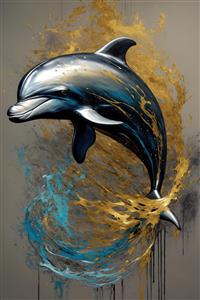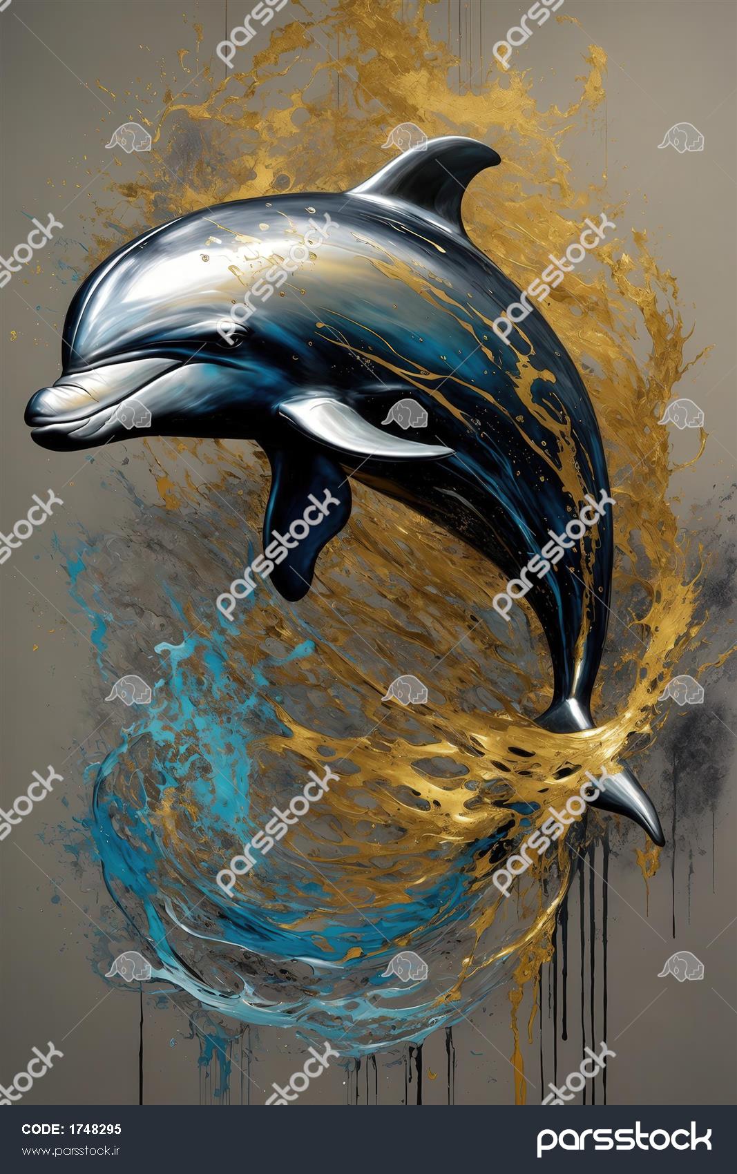 عکس دلفین آبی و طلایی در حال پرش از آبستره طلای مایع