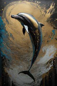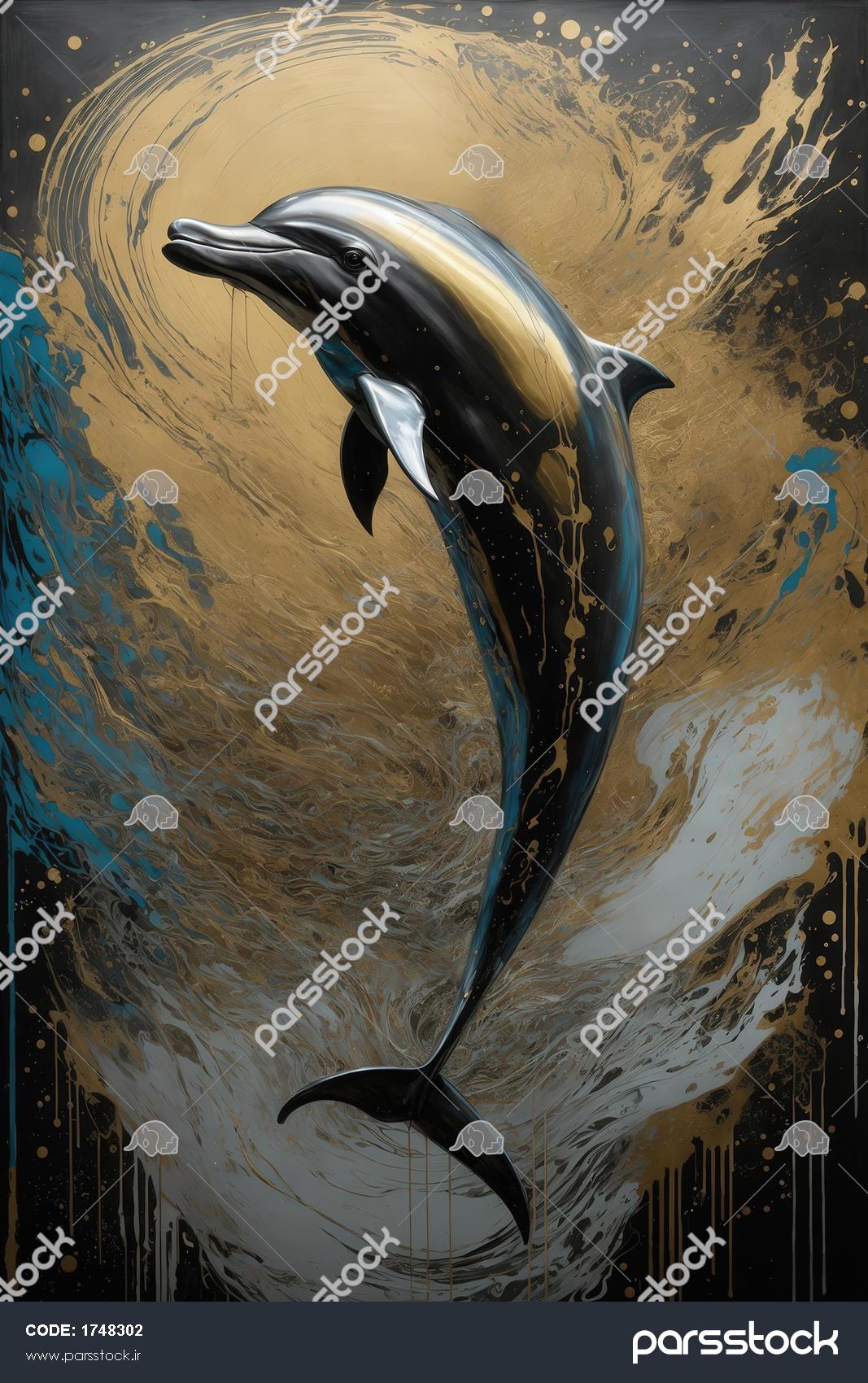 طرح دلفین سیاه و طلایی در حال پرش در پس‌زمینه آبستره لوکس