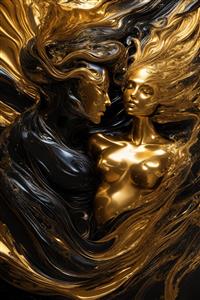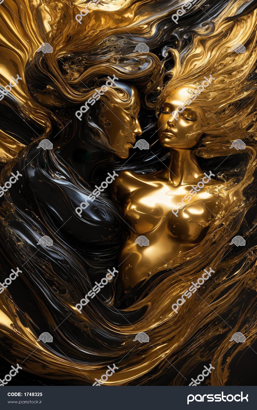 طرح زوج زن و مرد با مجسمه طلایی و موهای سیال مشکی برای تابلو