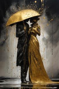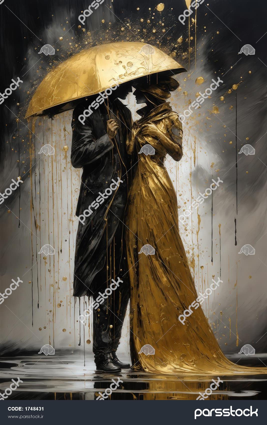 تصویر عاشقانه زوج زیر چتر طلایی برای تابلو لوکس اتاق خواب