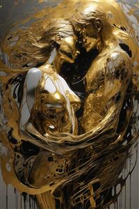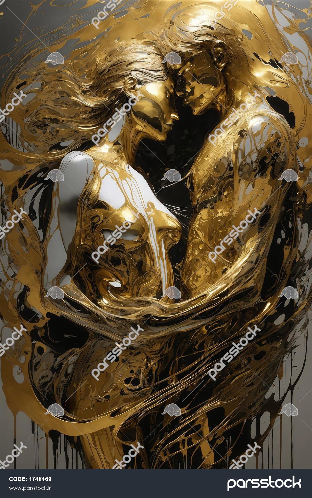 طرح مجسمه‌ای زوج در آغوش با جریان‌های طلایی و سفید آبستره