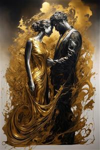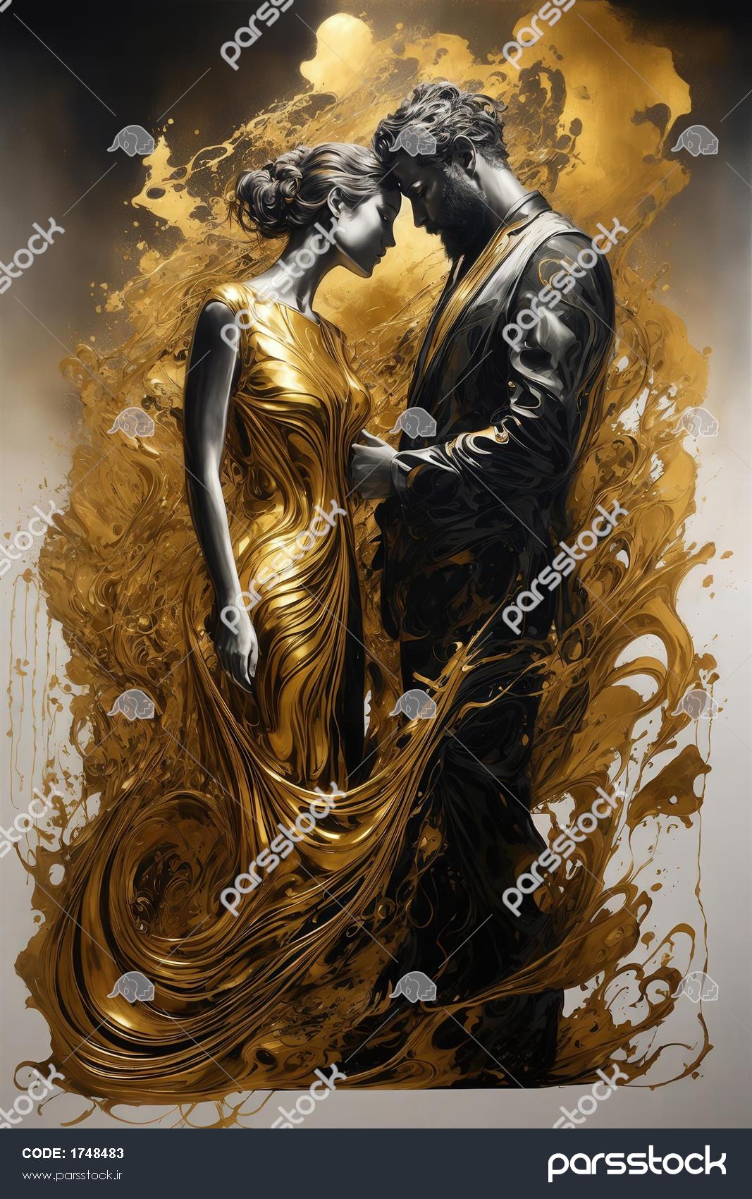 تصویر زوج رسمی با لباس طلایی و سیاه در میان قطرات و جریان‌های آبستره
